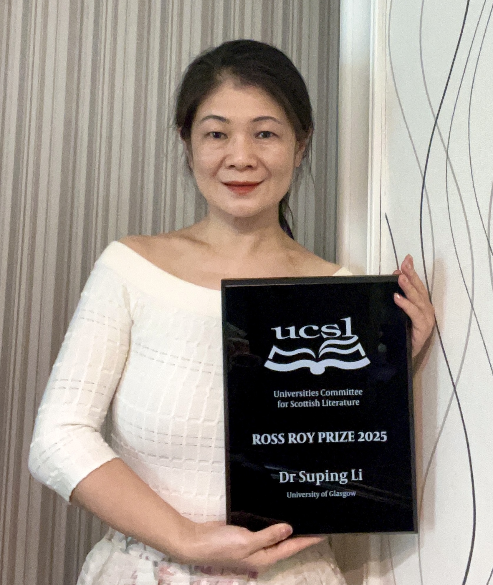 The winner of the Ross Roy Prize receives a cash prize and Dr Li was publicly recognised at the Saltire Society’s prestigious Fletcher of Saltoun Awards in December 2025. (Unable to attend, the prize was accepted by her supervisor Professor Murray Pittock.)